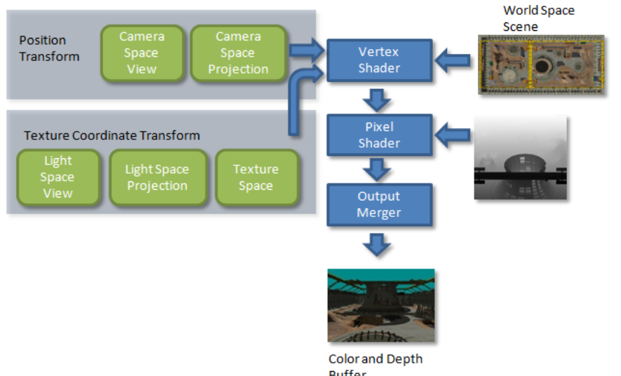 CPU에서 Light의 View Matrix, Projection Matrix를 미리 만들어 놓으면 shader에서 projection좌표를 구할 수 있다