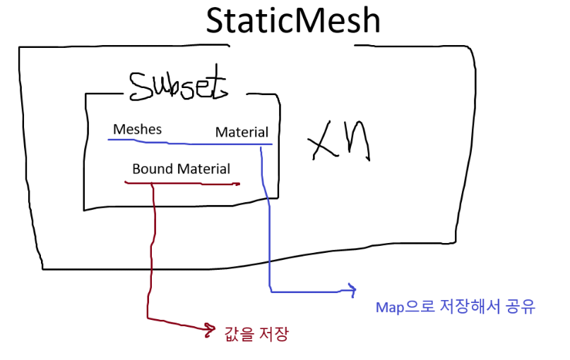 위에서 Mesh와 Material을 파싱했는데, 이것들을 아래의 구조로 저장을 하면, mesh의 material을 변경시킬 수 있다.