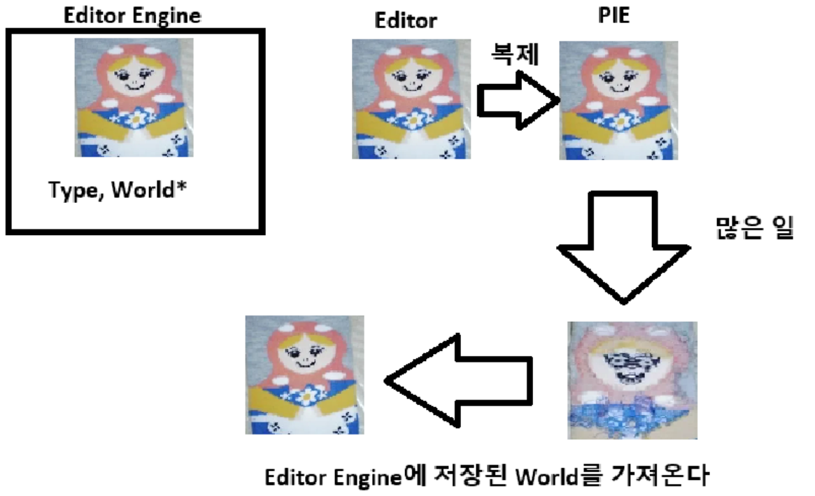 PIE World 에서는 PIE Tick에 따라서 많은 일이 발생한 경우, 초기 Editor World 로 돌아가기 어려울 것입니다.