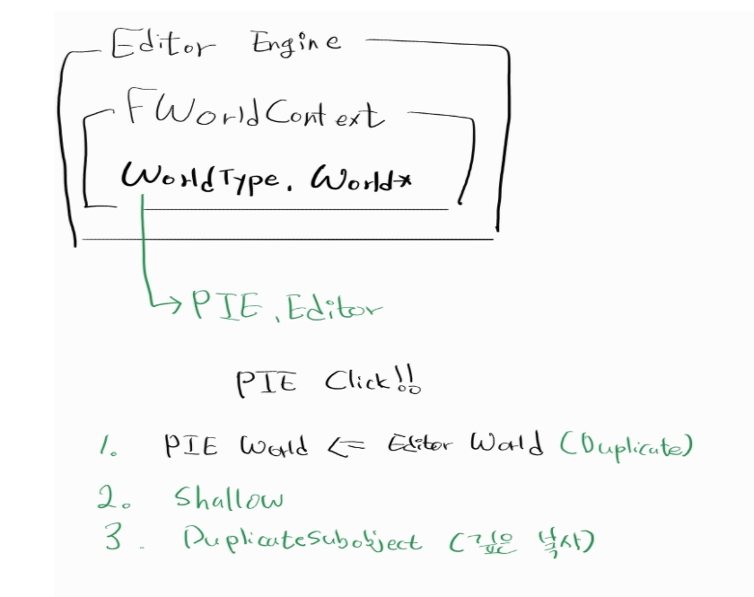 PIE를 구현하기 위해서는 Editor World 에 세팅을 해둔 정보, 값들을 PIE World에 복사를 해줘야합니다.
